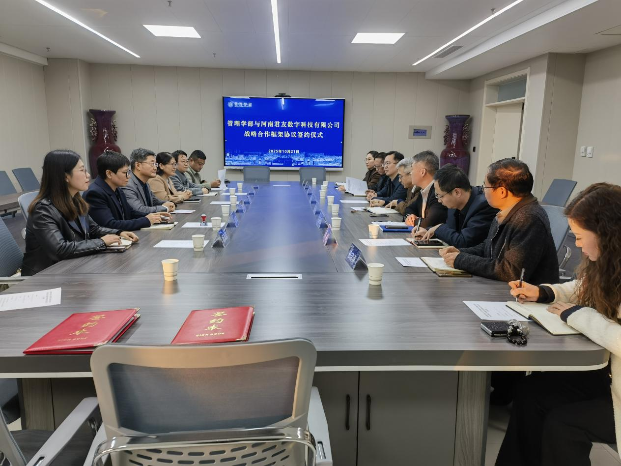 10月21日,管理学部与河南君友数字科技有限公司举行战略合作框架协议签约仪式。校合作发展部常务副部长杨凯,管理学部党委书记贺捷、执行部长王永伟,数据科学与电子商务学院院长崔春生,君友数字董事长徐延军参加仪式。
