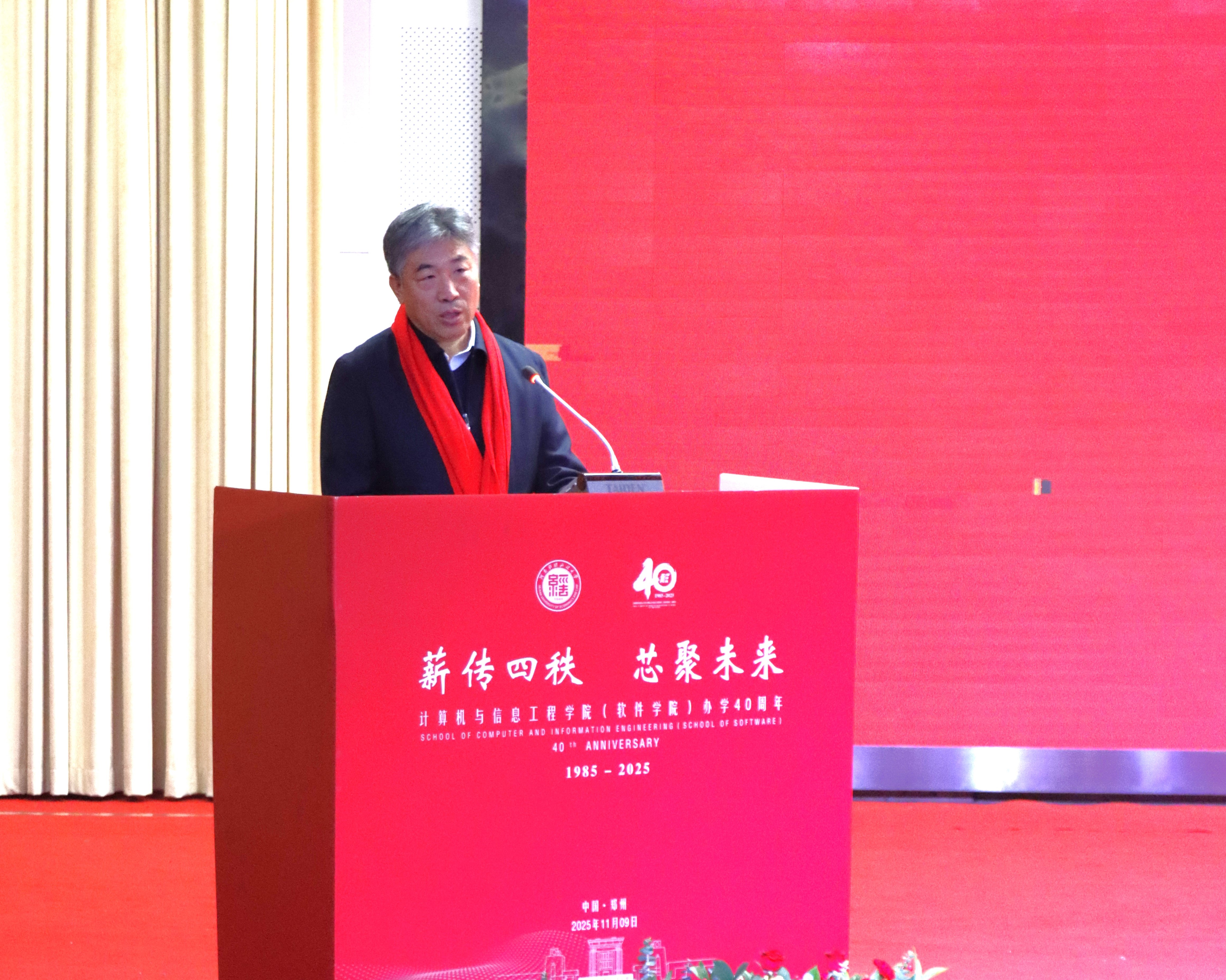 大会在庄严的国歌声中拉开帷幕。校党委书记、校长司林胜代表学校向学院全体师生员工和海内外校友致以诚挚的问候,向校友会换届的成功举行致以热烈祝贺。他表示,计算机与信息工程学院(软件学院)过去的四十年,是充分发挥育人职能、深刻诠释教育政治属性的担当四十年,是积极发挥服务效能、深刻诠释教育人民属性的责任四十年,是全力发挥支撑功能、深刻诠释教育战略属性的奋进四十年。他指出,学校启动综合改革的两年多来,全体师生以坚定的信念、坚实的步伐,共同绘就了学校改革波澜壮阔、生动热烈的全景图,学校资源配置显著优化,师生活力竞相迸发,学校的办学方式、育人模式、管理体制、保障机制焕发崭新气象。他表示,在学校“改革潮涌启新程,同舟逐浪创一流”的浓厚氛围里,学院作为大学办学的主体和基础,理应,也必须肩负更大使命、承载更多厚望。面向国家战略需求、立足学校改革实践,他希望计算机与信息工程学院(软件学院)勇立数字潮头,在新的历史起点上,紧扣国家战略所需,在学科攀峰上塑造新优势;紧跟学校改革所指,在躬身入局上展现新担当;紧抓事业发展所切,在攻坚克难上谋划新举措;紧贴广大校友所盼,在双向赋能上迈出新步伐,努力在学校创建特色鲜明高水平应用研究型大学的壮美篇章上留下浓墨重彩。