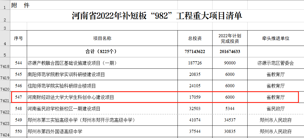 近日,河南省发展和改革委员会发布《关于印发河南省2022年补短板“982”工程实施方案的通知》(豫发改投资〔2022〕102号),我校“大学生科创中心”项目获批立项。