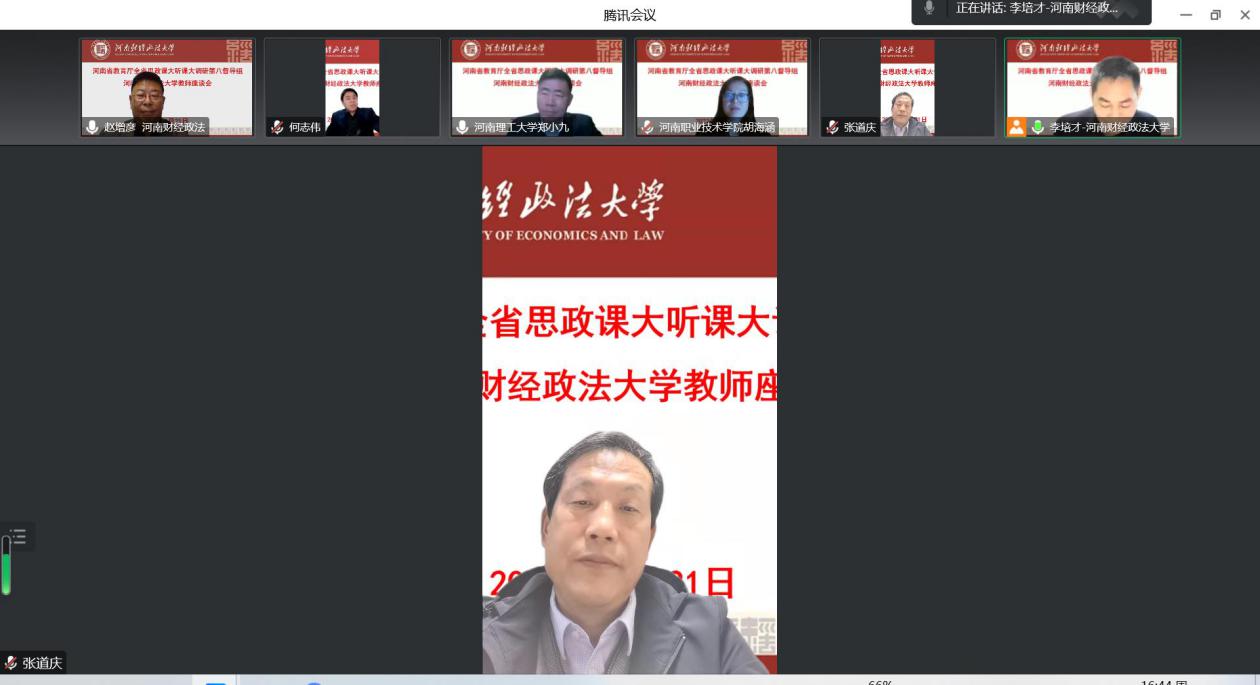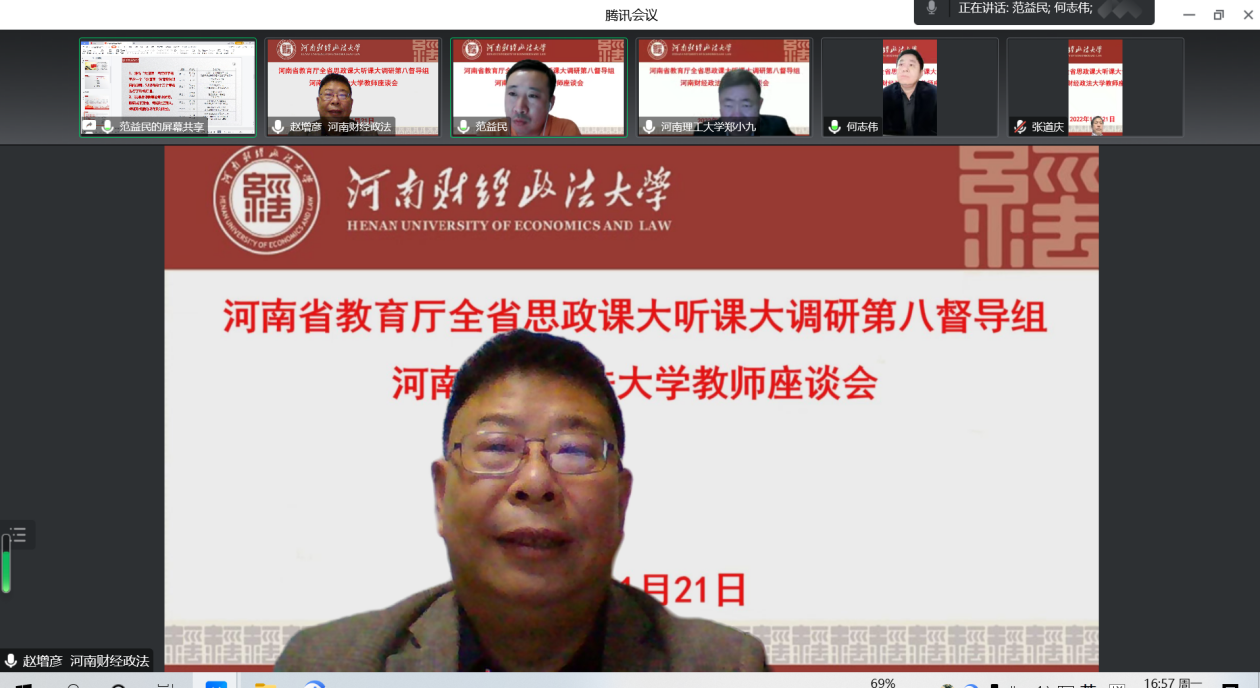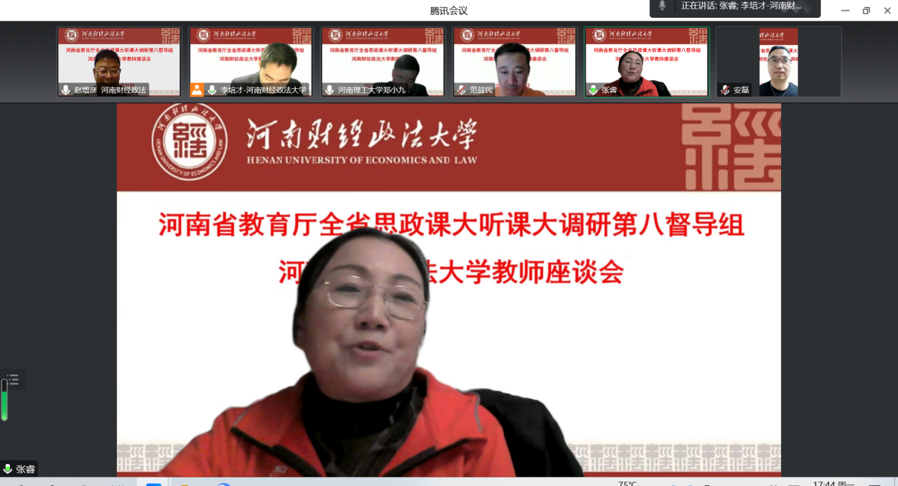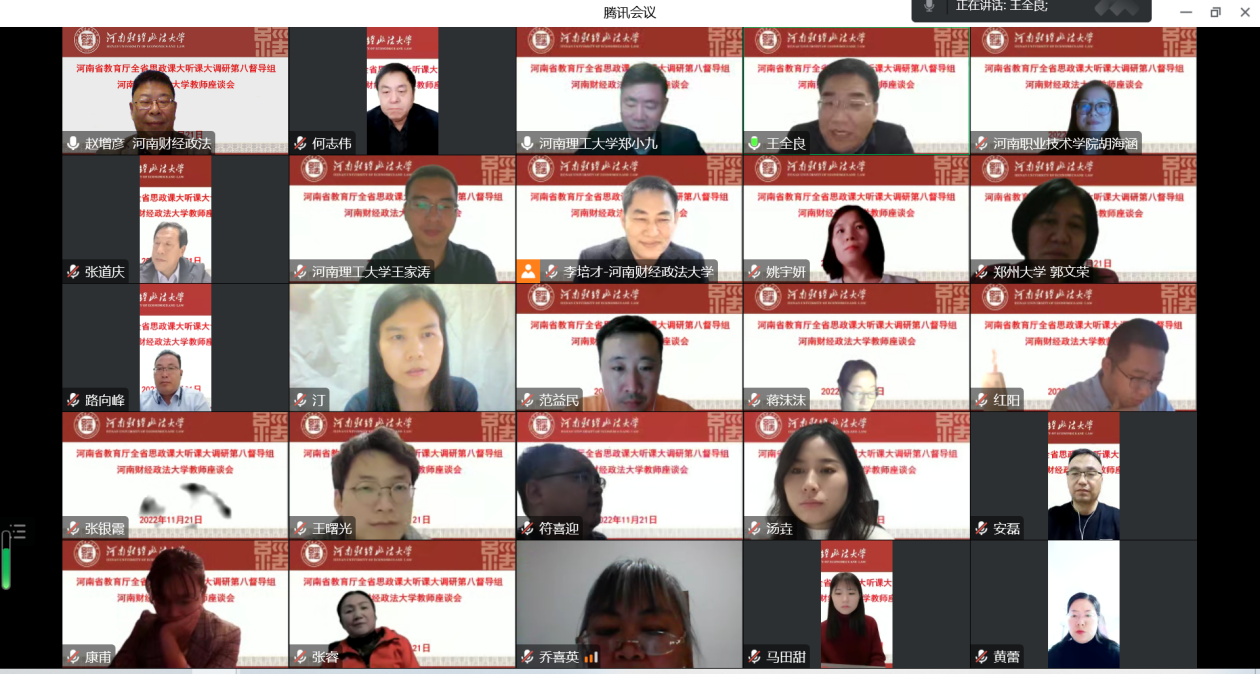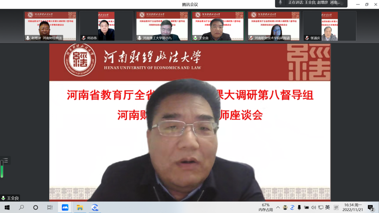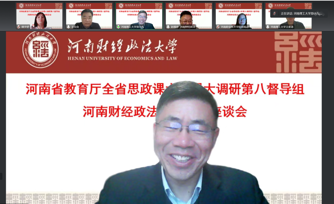 根据河南省委教育工委河南省教育厅《关于开展2022年度全省高校思政课秋季学期“大听课”“大调研”活动的通知》安排,11月21日下午,省第八调研组对我校思政课教学组织实施等情况以线上方式进行深入调研。调研组组长、河南省高校思政课教指委《思想道德与法治》分教指委副主任委员、河南理工大学马克思主义学院院长郑小九教授,调研组成员郑州大学郭文荣教授、河南职业技术学院胡海涵教授、河南理工大学王家涛博士等参加调研。校党委副书记王全良出席教师座谈会。