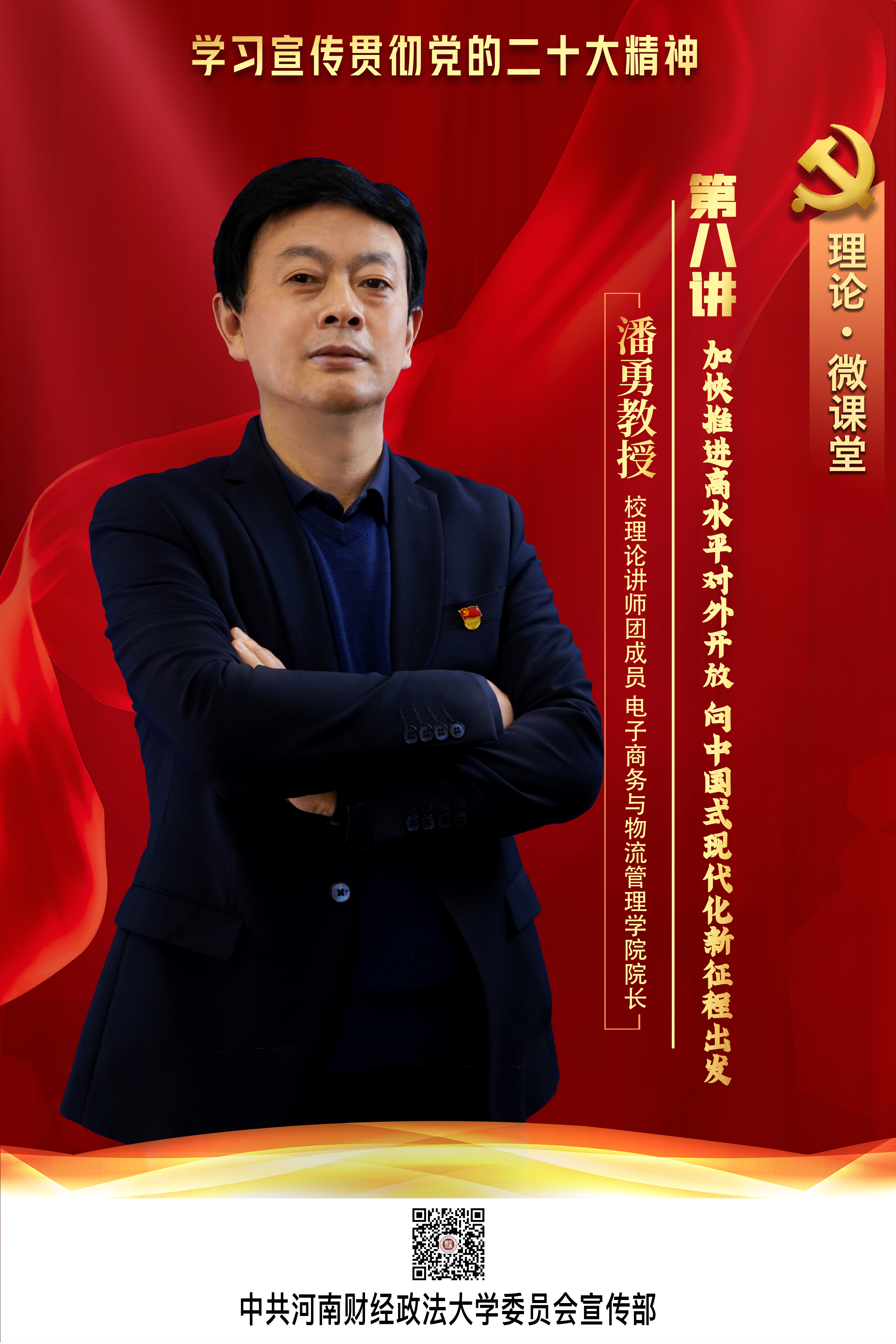 今天,一起进行第八讲的学习:由校理论讲师团成员、电子商务与物流管理学院院长潘勇主讲的《加快推进高水平对外开放 向中国式现代化新征程出发》。