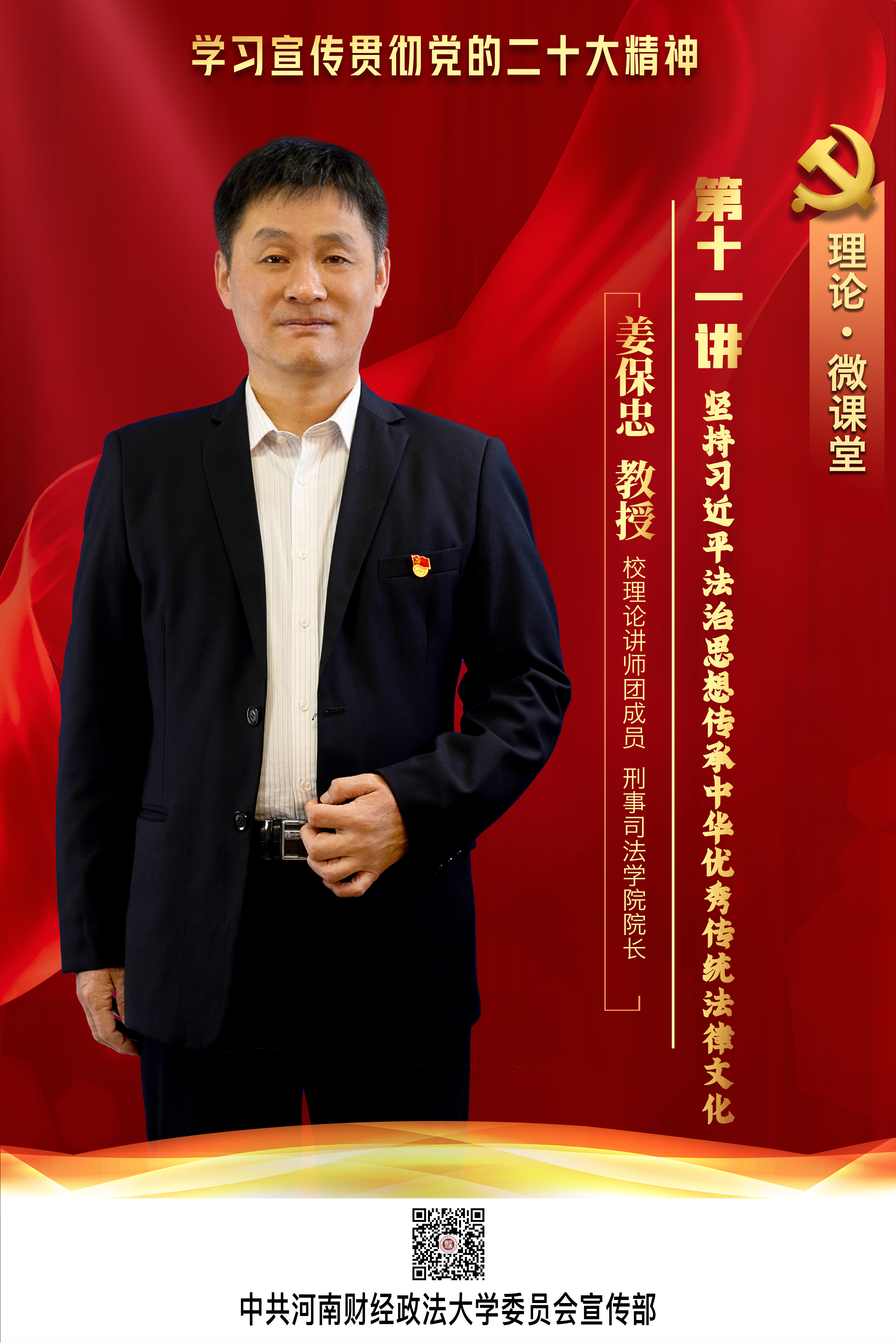 今天,一起进行第十一讲的学习:由校理论讲师团成员、刑事司法学院院长姜保忠主讲的《坚持习近平法治思想传承中华优秀传统法律文化》。