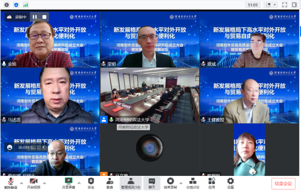 中国国际贸易学会会长金旭、河南对外经济贸易学院院长石国华也分别致辞。与会领导共同为河南对外贸易高质量发展研究院成立揭牌。河南省商务厅、郑州海关分别与河南财经政法大学签署全面合作备忘录。