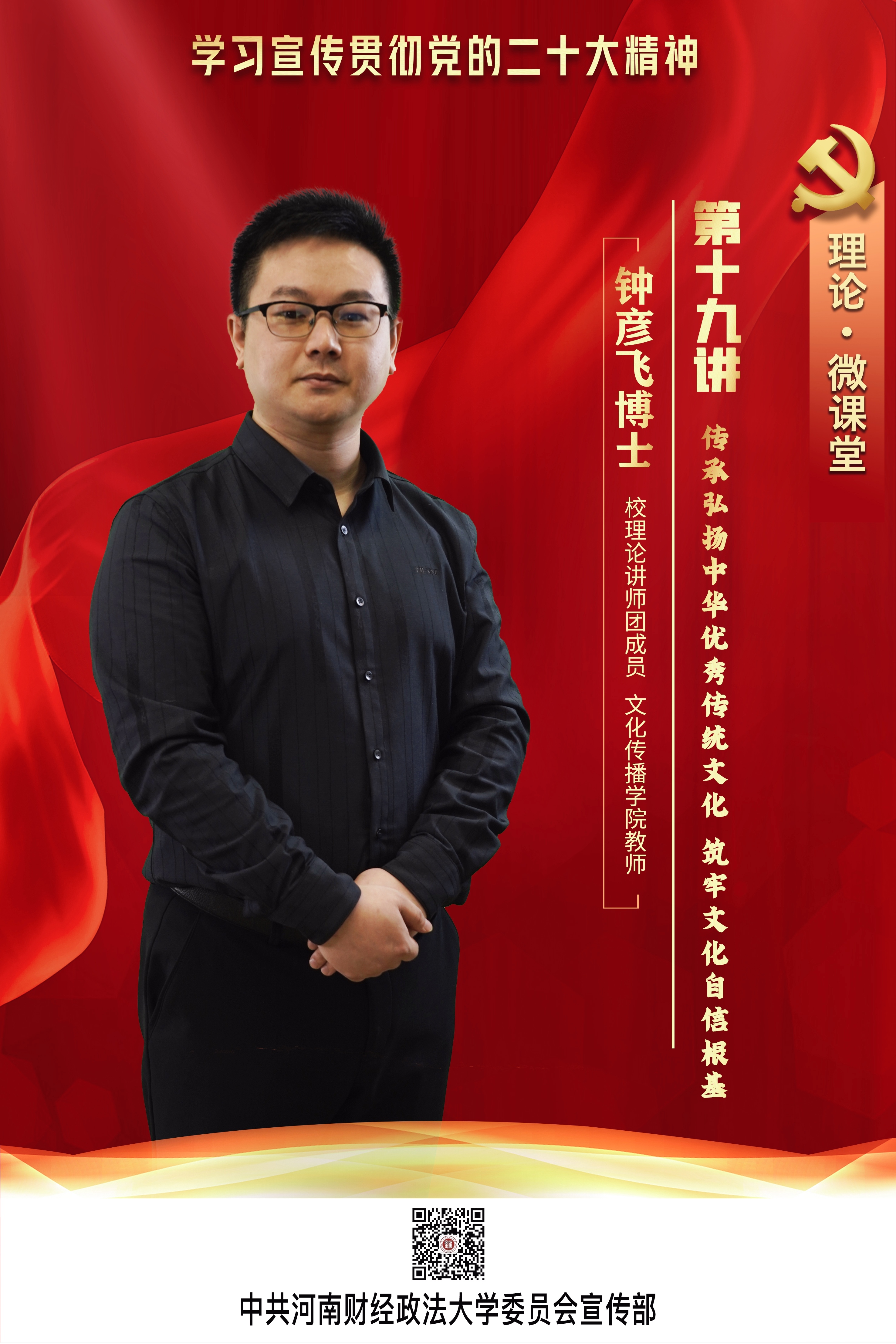 今天,一起进行第十九讲的学习:由校理论讲师团成员、文化传播学院教师钟彦飞主讲的《传承弘扬中华优秀传统文化 筑牢文化自信根基》。